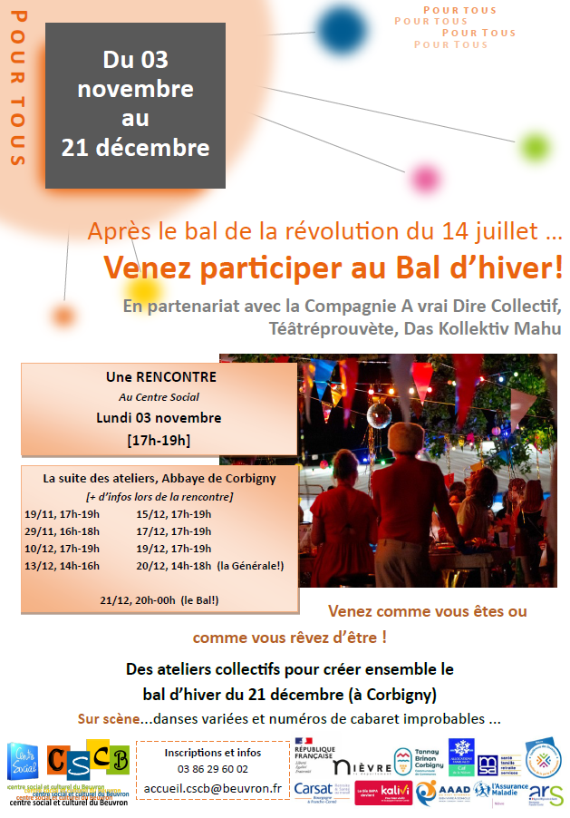 Pour le bal de l’hiver : nous aurons aussi besoin de bénévolesqui encadrent avec nous, qui servent au bar, à l’organisation… Donc personnes précieuses qui veulent s’y associer autrement qu’en tant qu’artiste, sont bienvenues aussi, donnez notre contact ! Merci !